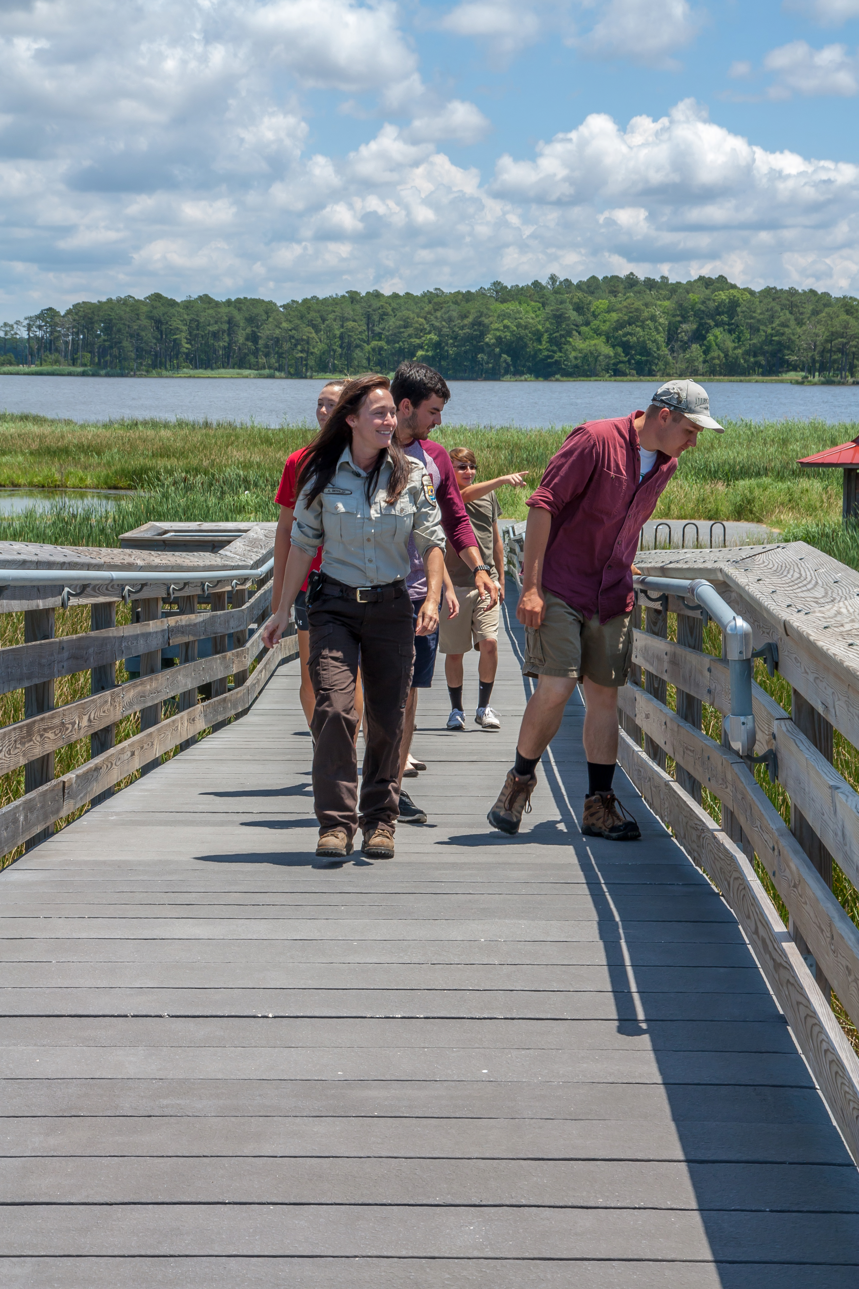 Fish and Wildlife Service staff leads group of high school students up boardwalk
