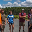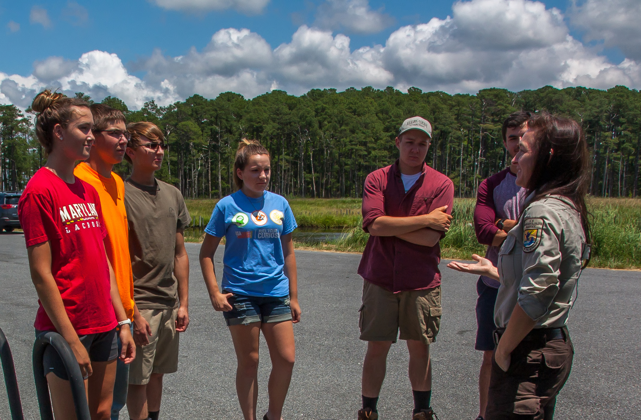 Fish and Wildlife Service staff talks to group of high school students at kiosk
