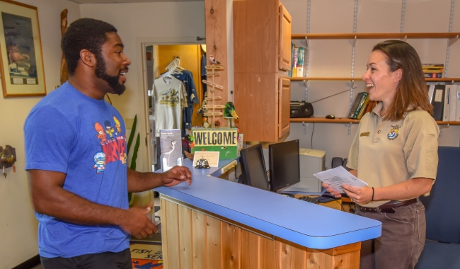 Fish and Wildlife Service Staffer greets visitor at visitor center desk