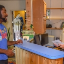 FWS Staffer greets visitor at visitor center desk.