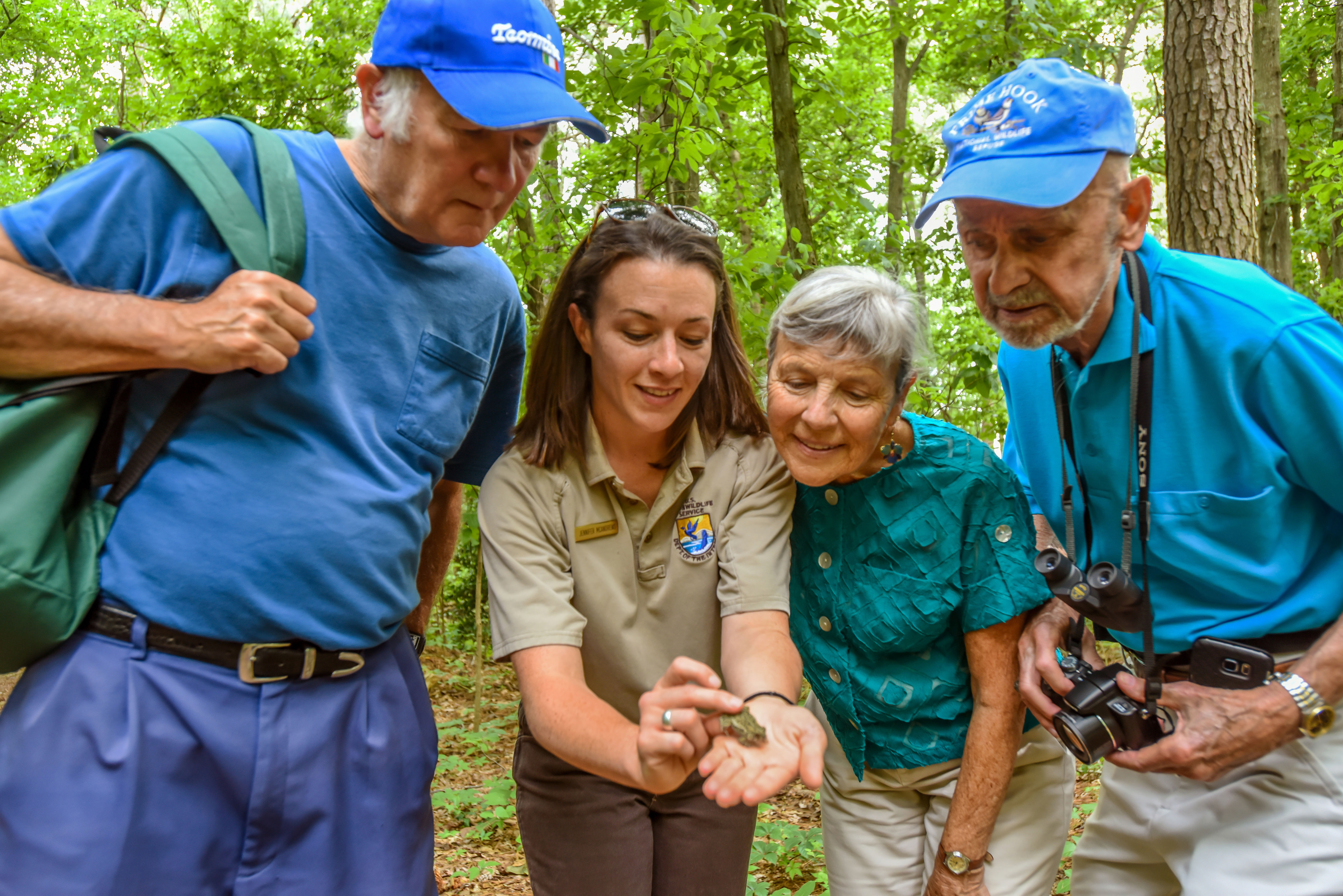Fish and Wildlife Service visitor services staffer shows toad to visitors