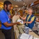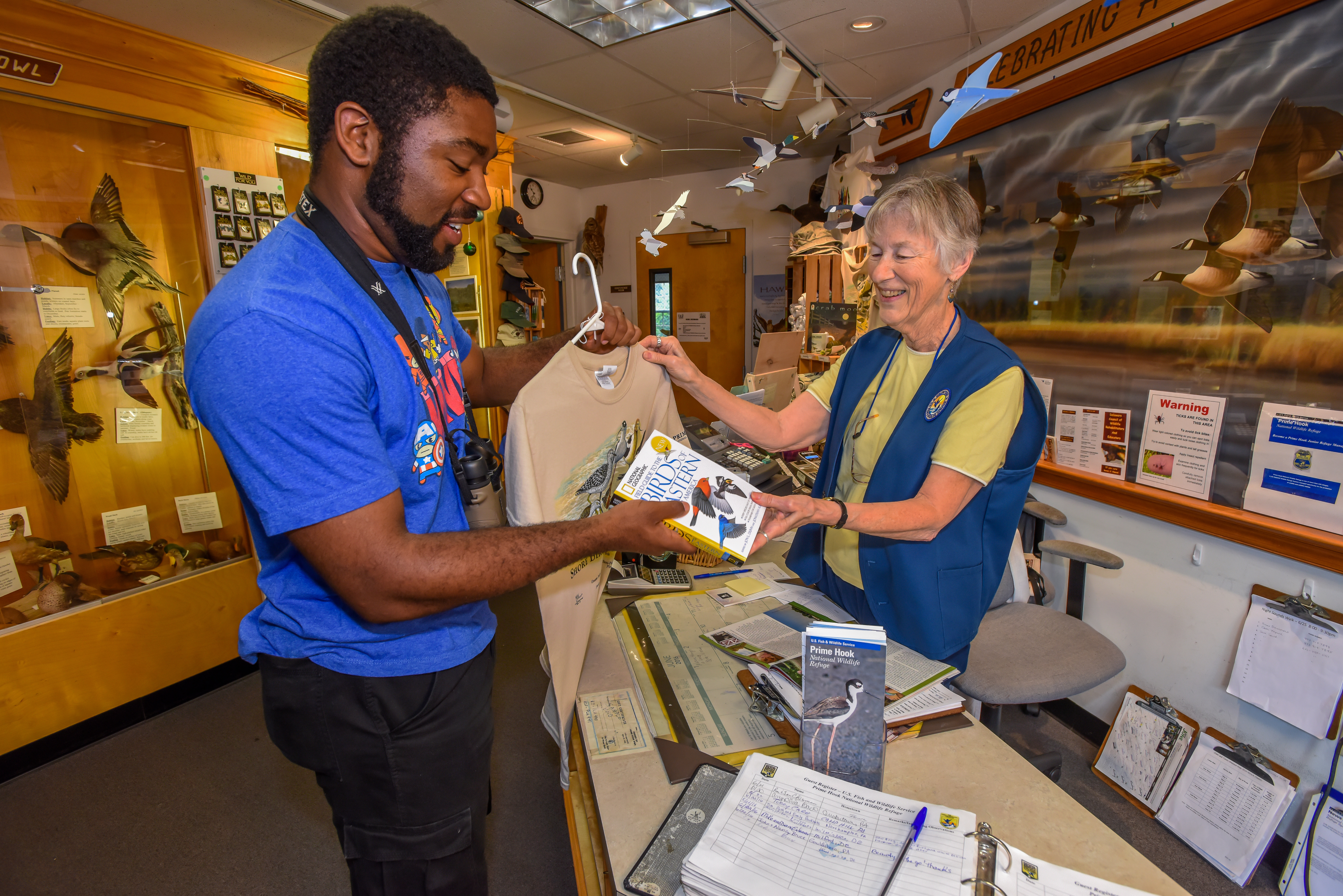 Fish and Wildlife Service volunteer with visitor in gift shop