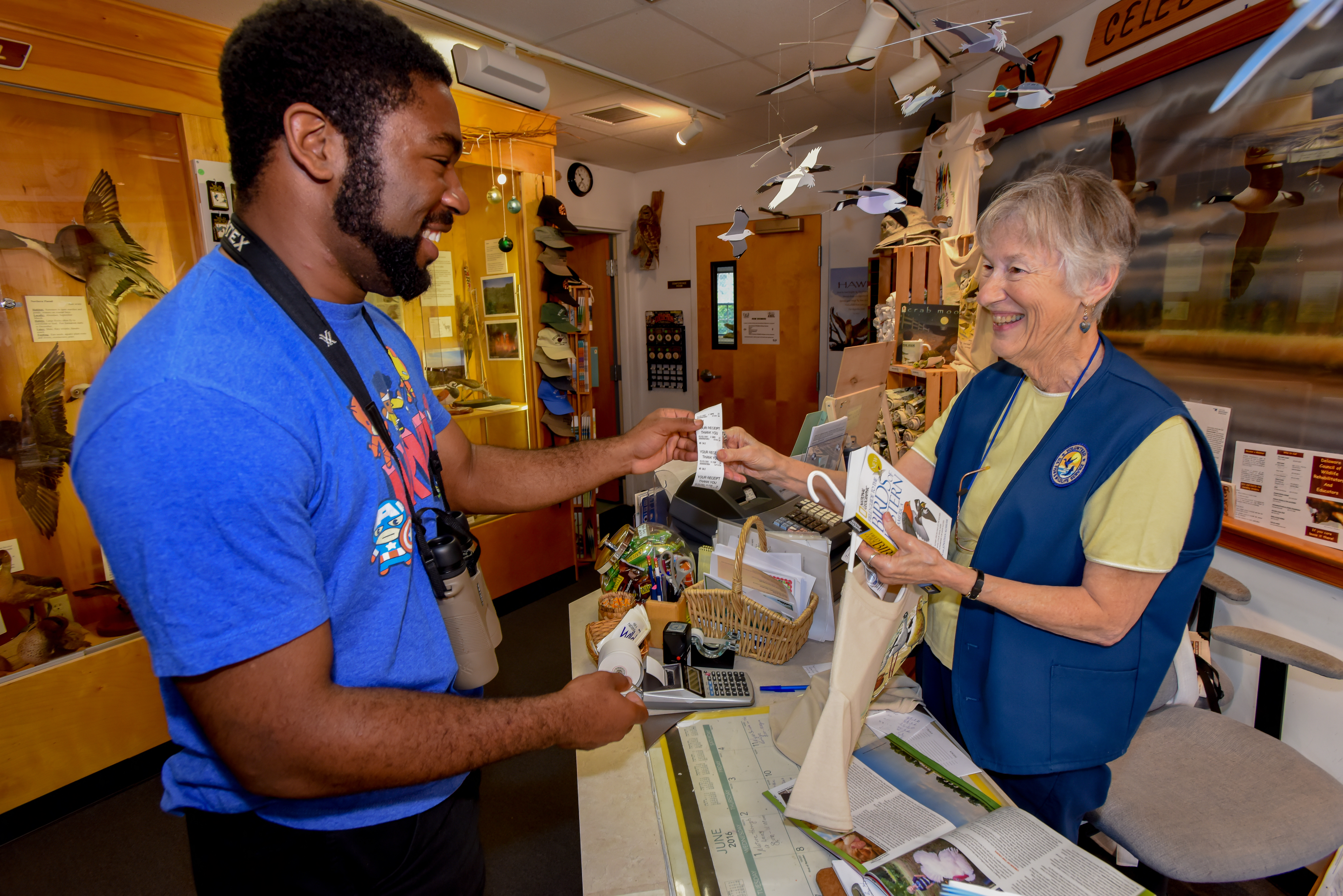 Fish and Wildlife Service volunteer with visitor in gift shop