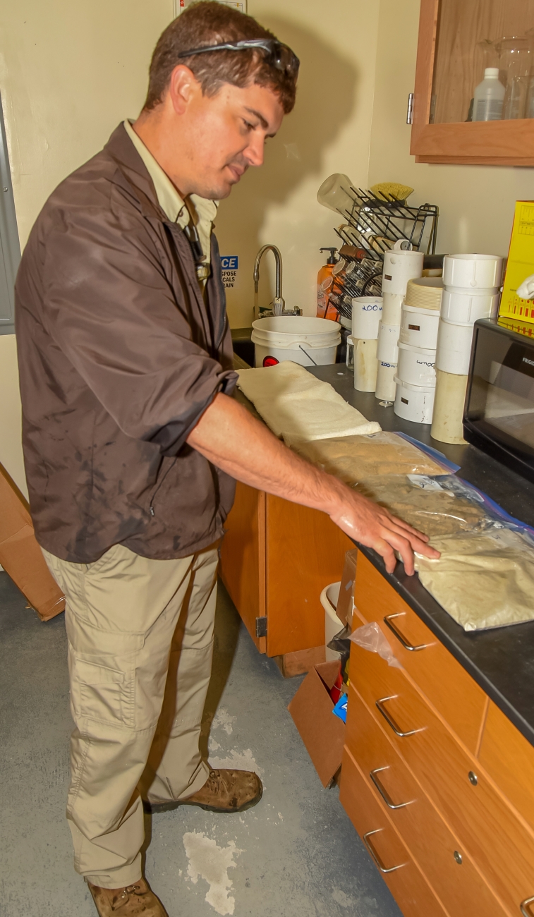 FWS mussel biologist, Jonathan Wardell , examines equipment at Orangeburg National Fish Hatchery