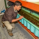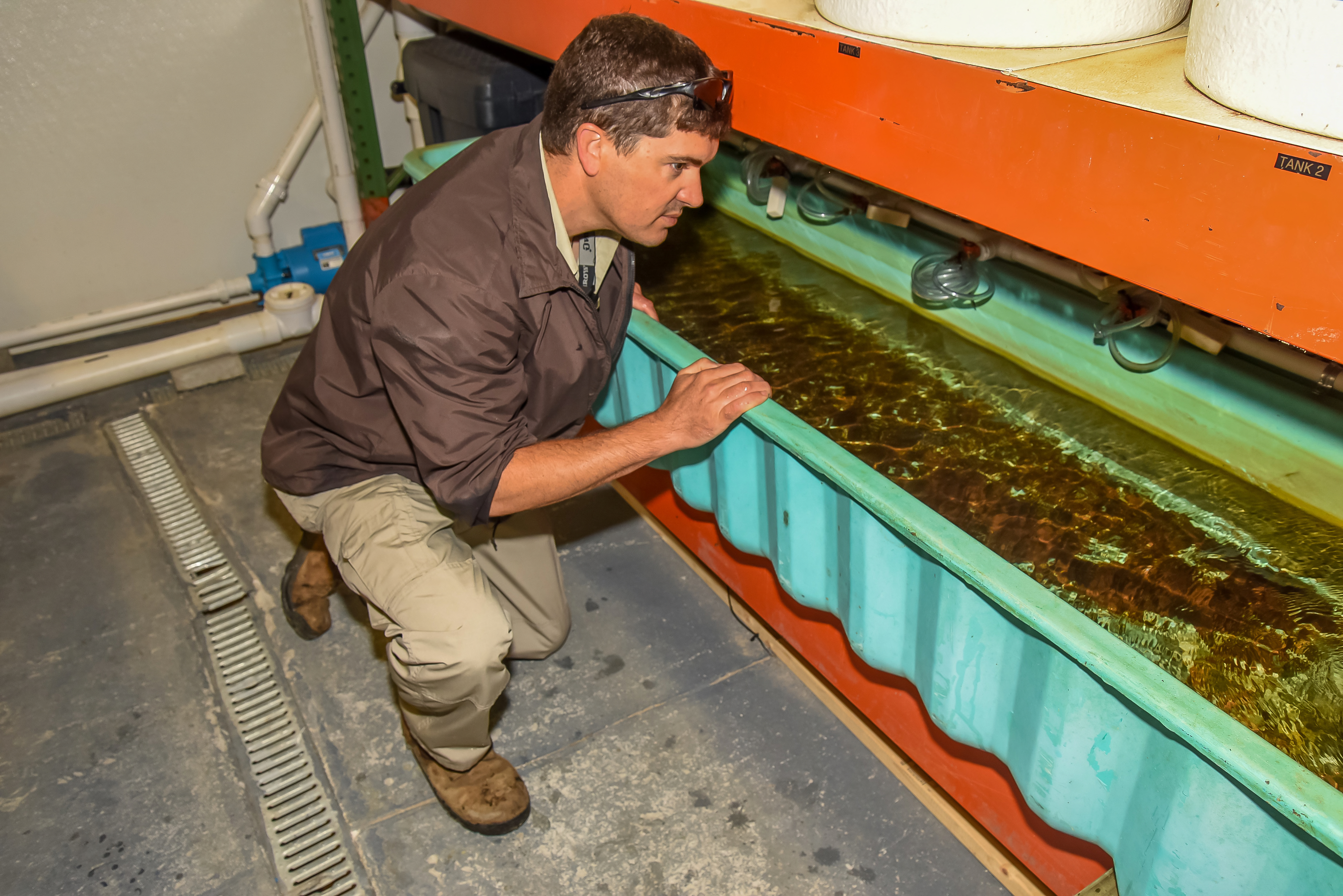 FWS mussel biologist, Jonathan Wardell, examines equipment at Orangeburg National Fish Hartchery