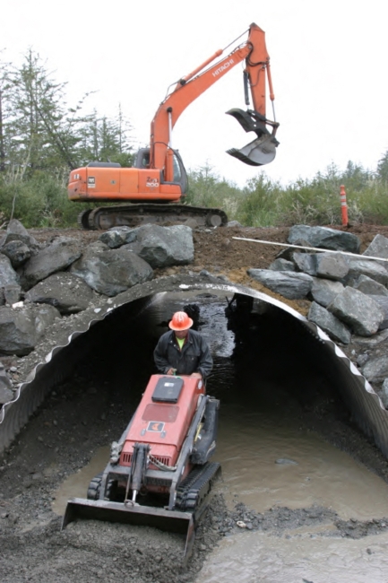 Federal Highways Administration subcontractor Tidewater Contractors fills the bottom of the newly installed Fahys Creek culvert with river gravels for fish habitat.