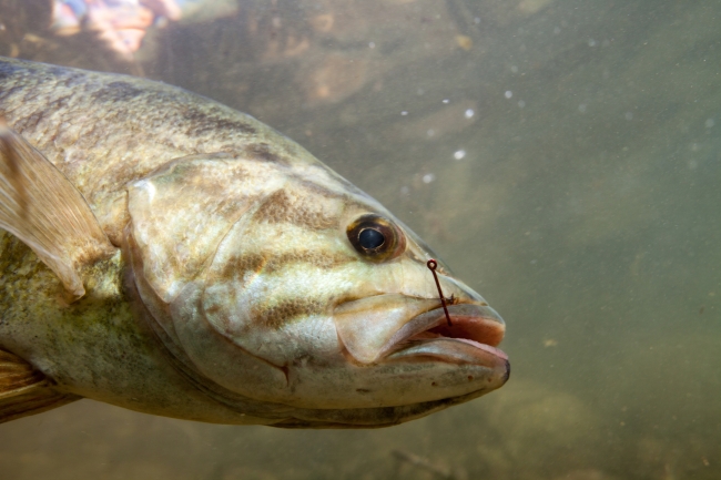 Underwater shot of a fish hook in a Smallmouth bass.