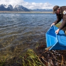 Refuge Manager Bill West (2008-2018) releases a cutthroat trout into Widgeon Pond at Red Rock Lakes National Wildlife Refuge. Photo by James "Newt" Perdue/USFWS Volunteer.