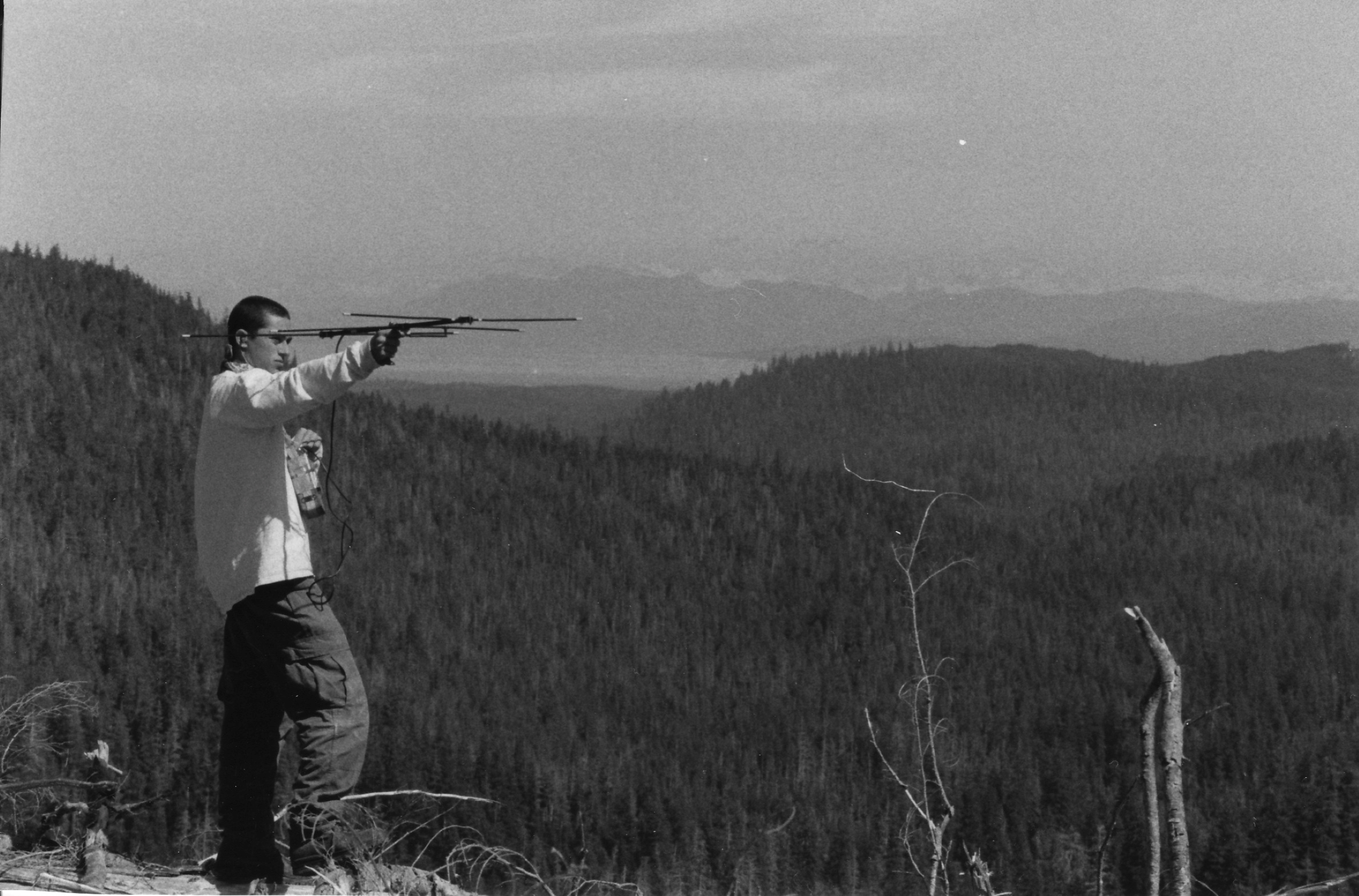 Joshua Fisher attempts to locate a radio tagged bat in Alaska, 1999.
