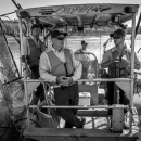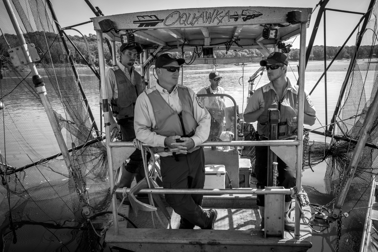 Fisheries crew of the U.S. Fish and Wildlife Service boat, The Magna Carpa, on Missouri River, near Big Muddy NWR, Missouri.