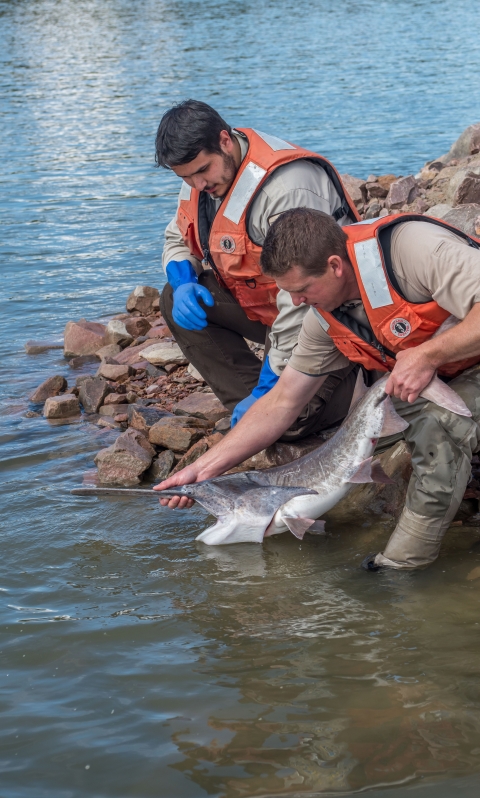 Fisheries workers releasing paddlefish (Polyodon spathula) at Gavins Point Dam on the Missouri River in South Dakota.