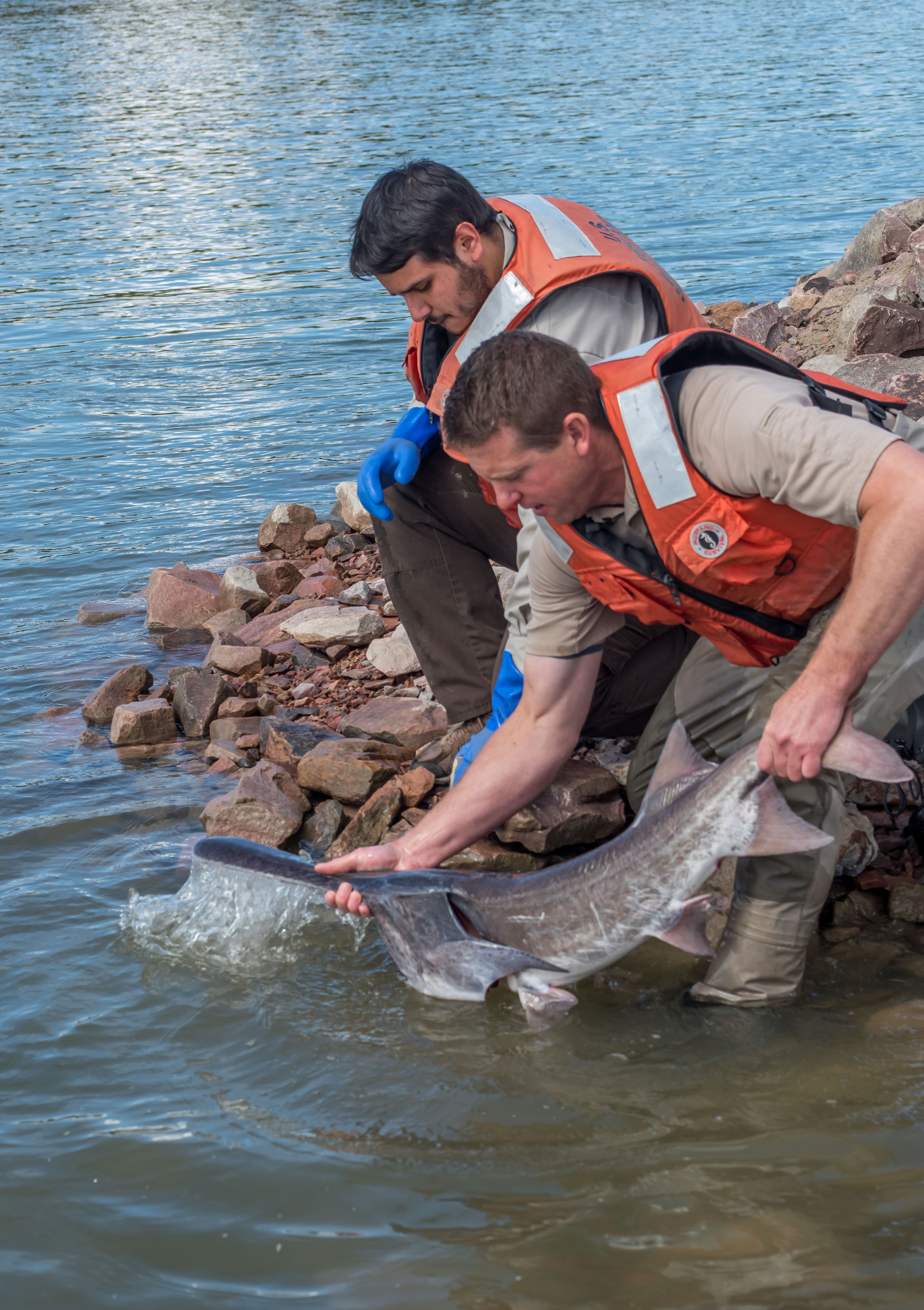 Fisheries workers releasing paddlefish (Polyodon spathula) at Gavins Point Dam on the Missouri River in South Dakota.