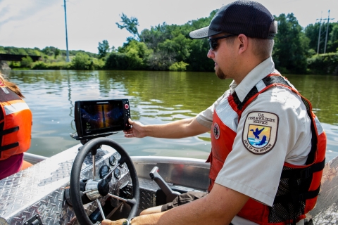 U.S. Fish and Wildlife Service biologist checks sonar in the Fox River.