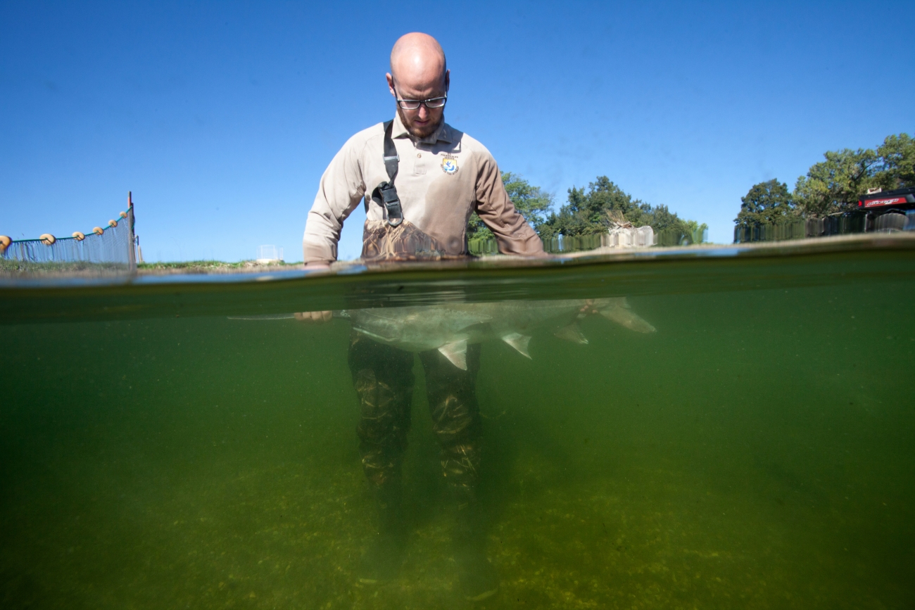Fishery biologist examines an American paddlefish