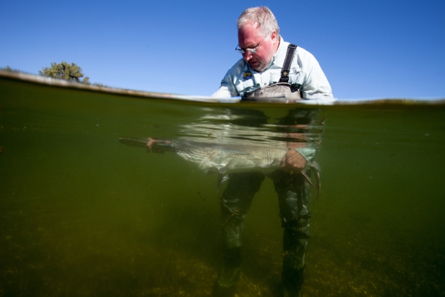 Fishery biologist surveys a American paddlefish.