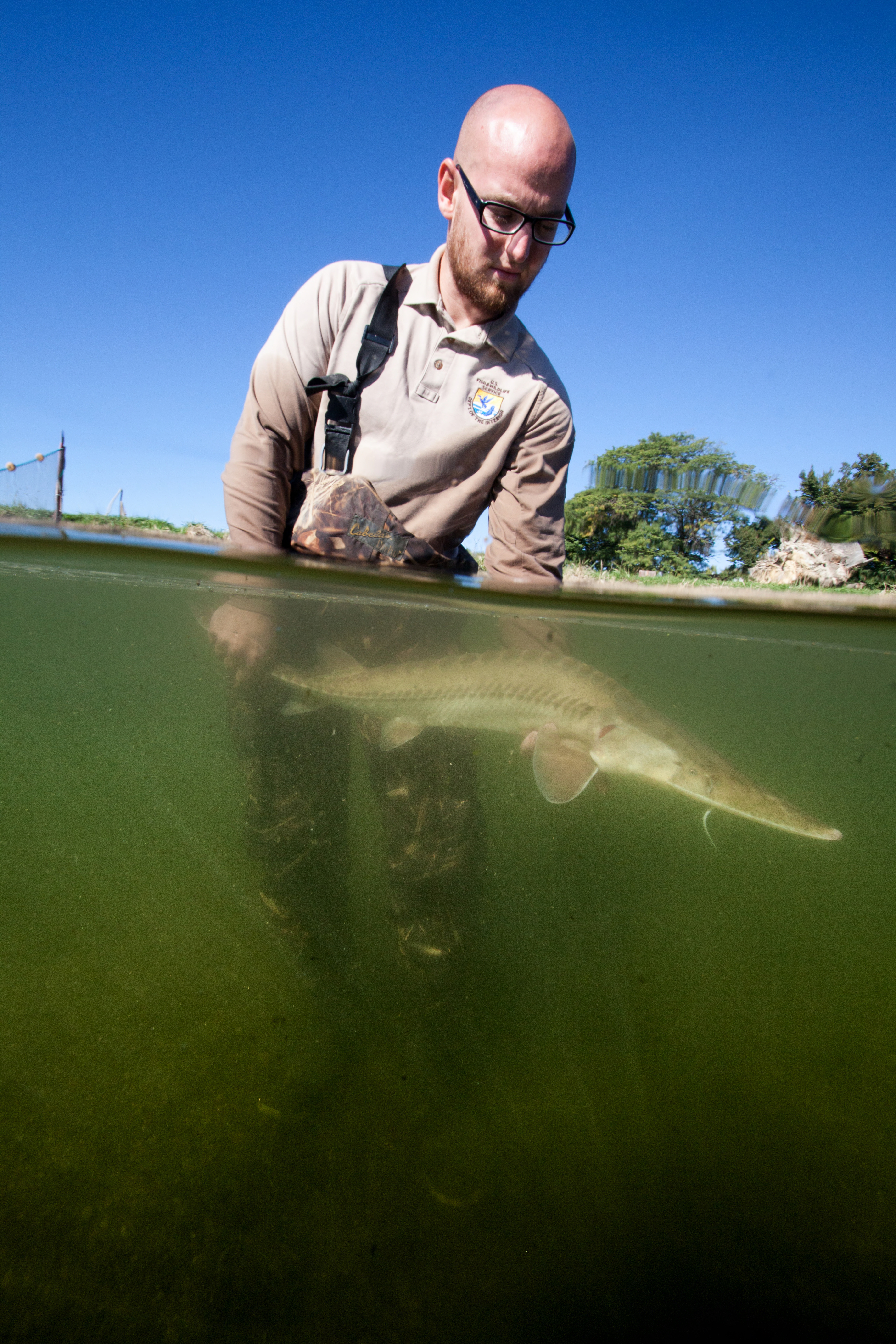 Fishery biologist surveys a Pallid sturgeon at Gavins Point National Fish Hatchery.