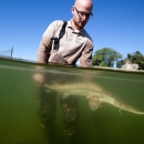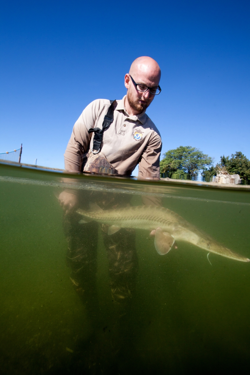 Fishery biologist surveys a Pallid sturgeon at Gavins Point National Fish Hatchery.