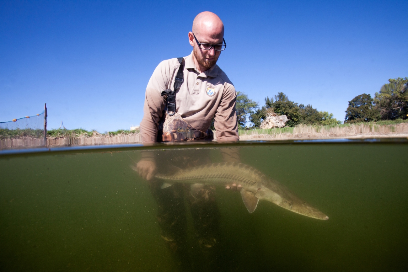 Fishery biologist surveys a Pallid sturgeon at Gavins Point National Fish Hatchery.