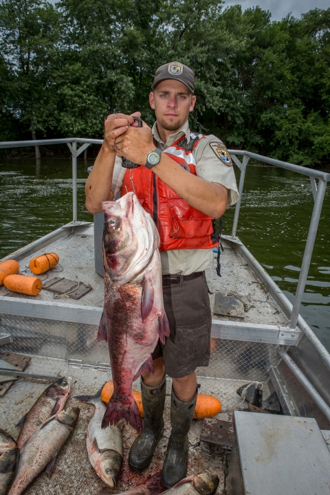 U.S. Fish and Wildlife Service fishery biologist weighs large Bighead carp