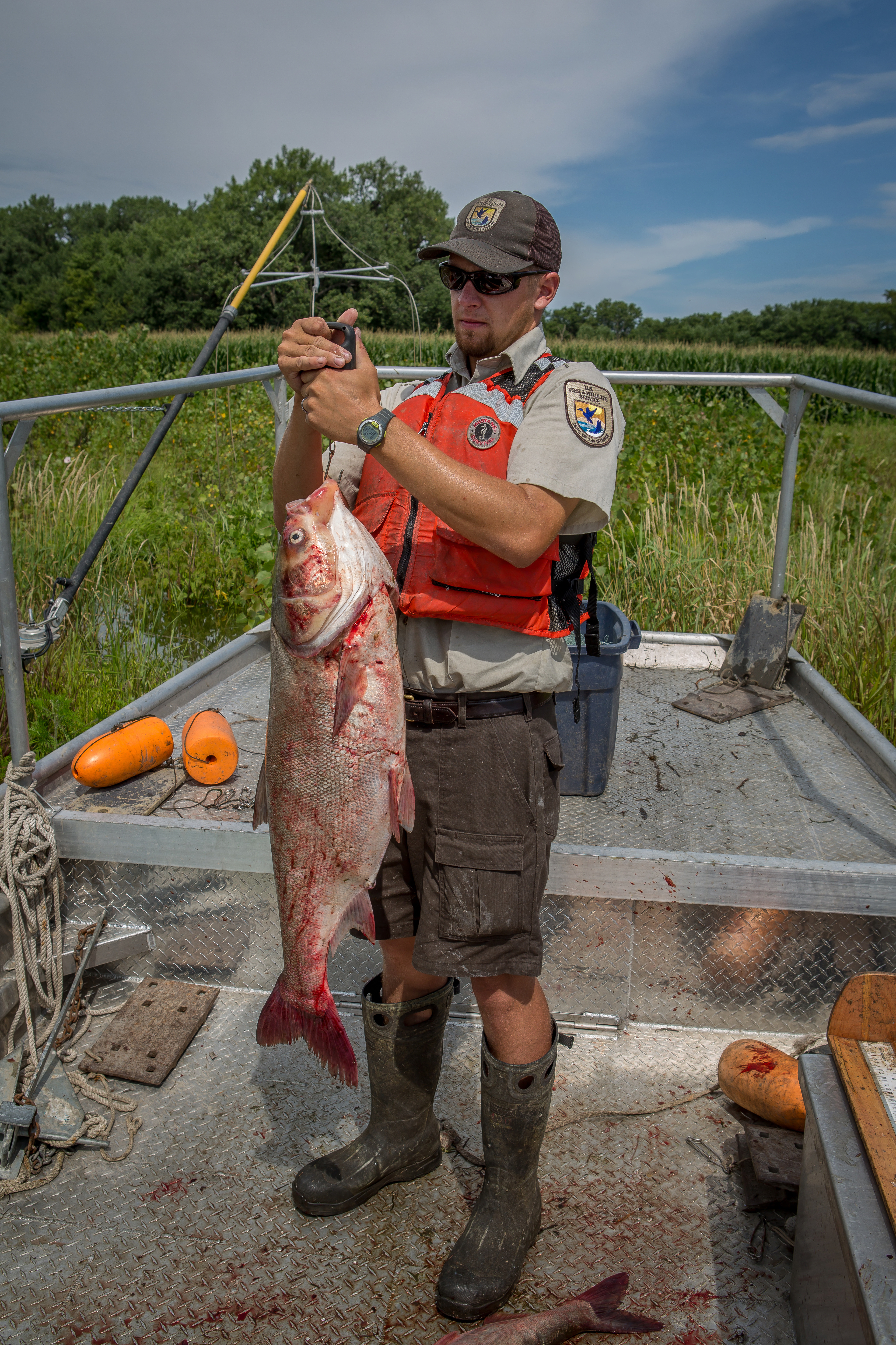 U.S. Fish and Wildlife Service fishery biologist weighs large Silver carp
