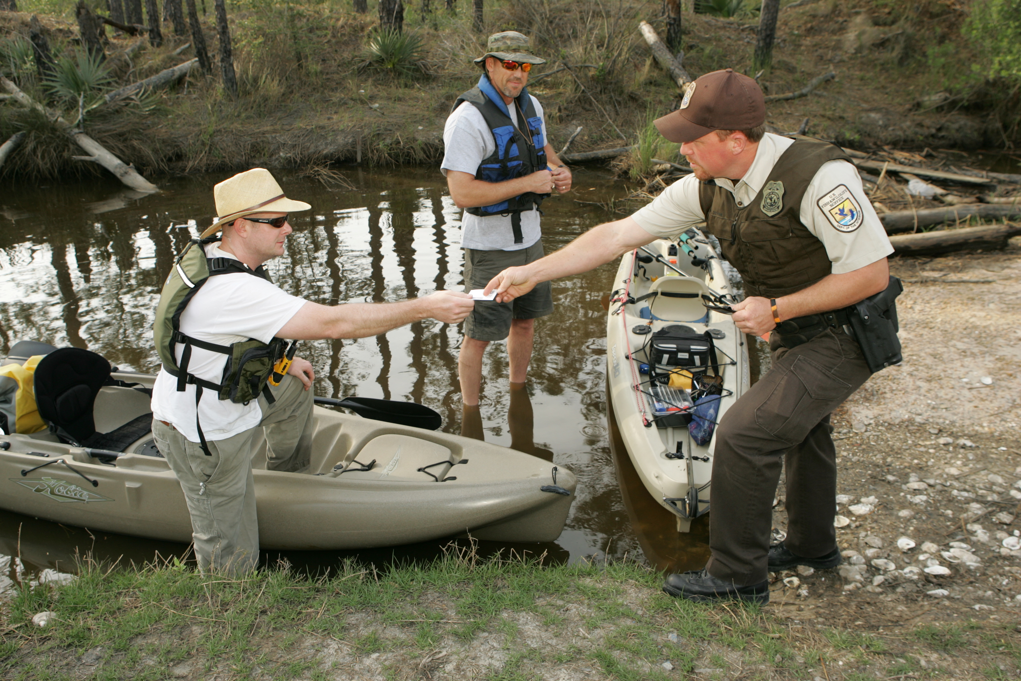 Big Branch Marsh National Wildlife Refuge Law Enforcement officer checks for compliance of fishing licence.