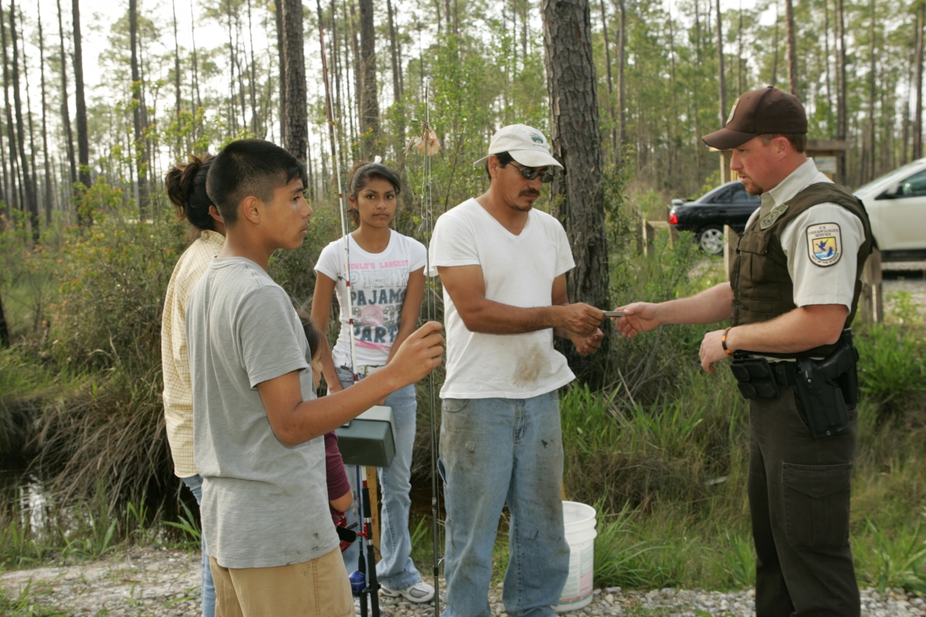 Big Branch Marsh National Wildlife Refuge Law Enforcement officer checks for compliance of fishing licence.