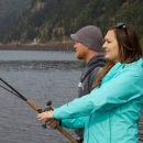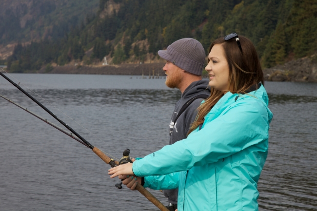 Anglers on shore fish for Fall Salmon on the Columbia River. Pacific Northwest Fisheries.