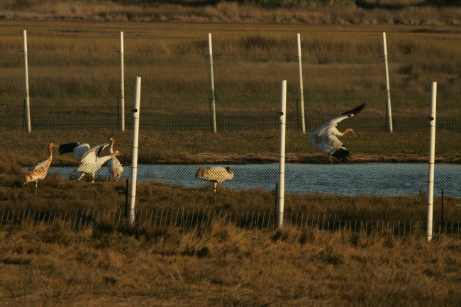 Frolicking Whooping Cranes inside protected pen at St. Marks National Wildlife Refuge.