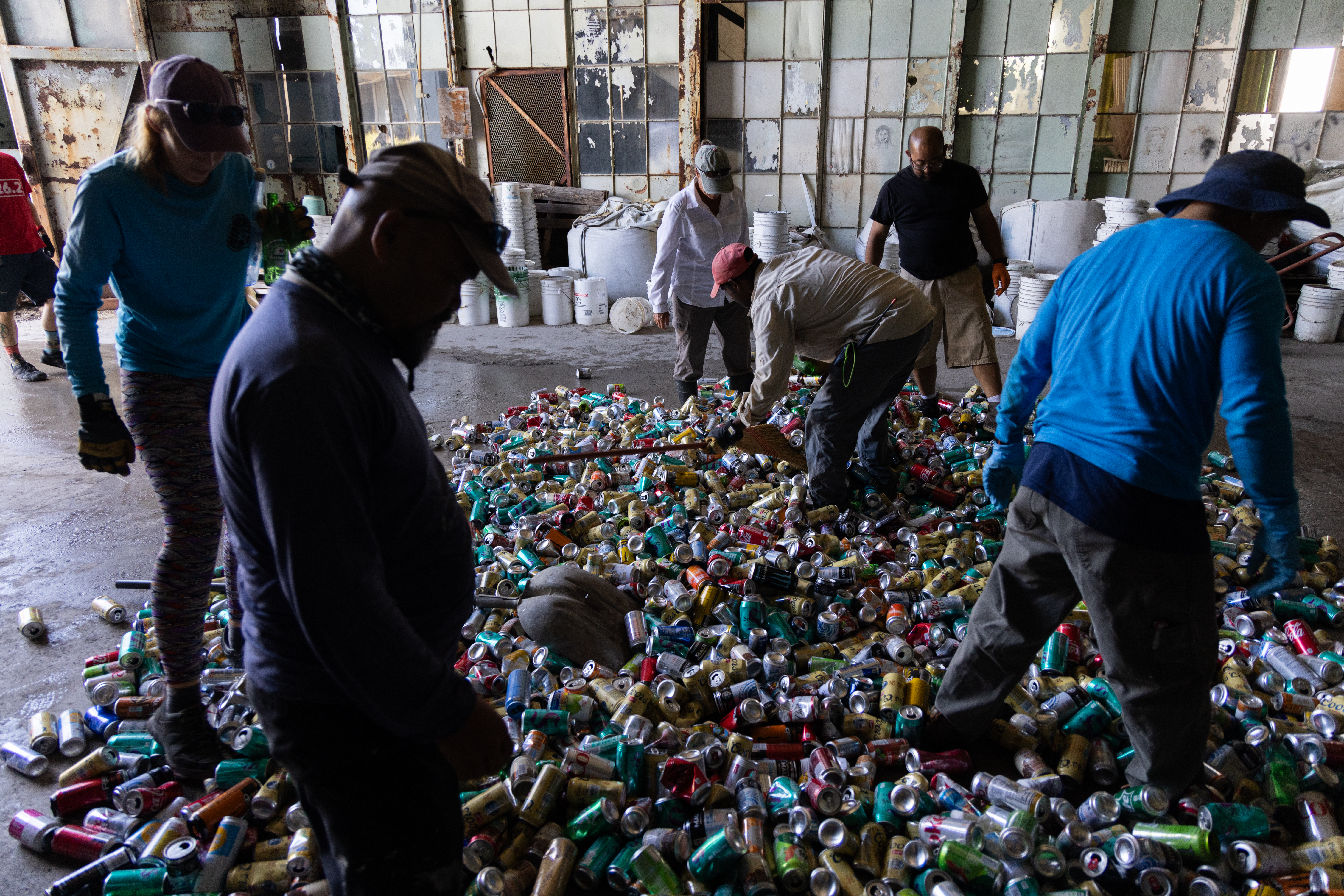 Members of the Human Based Food Source Team (PHATT) flattening recycling with heavy equipment on Midway Atoll National Wildlife Refuge during the Seabird Protection Project.