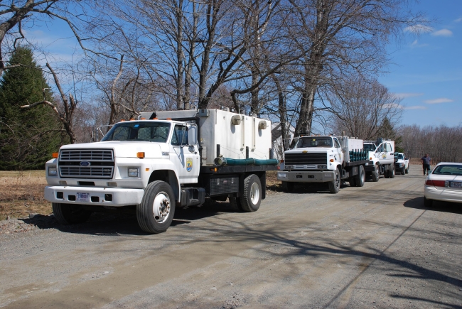 Fleet of four trucks at the stocking site on the Pleasant River in Milo, Maine.