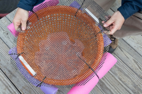 Floating basket. Freshwater mussel culture