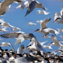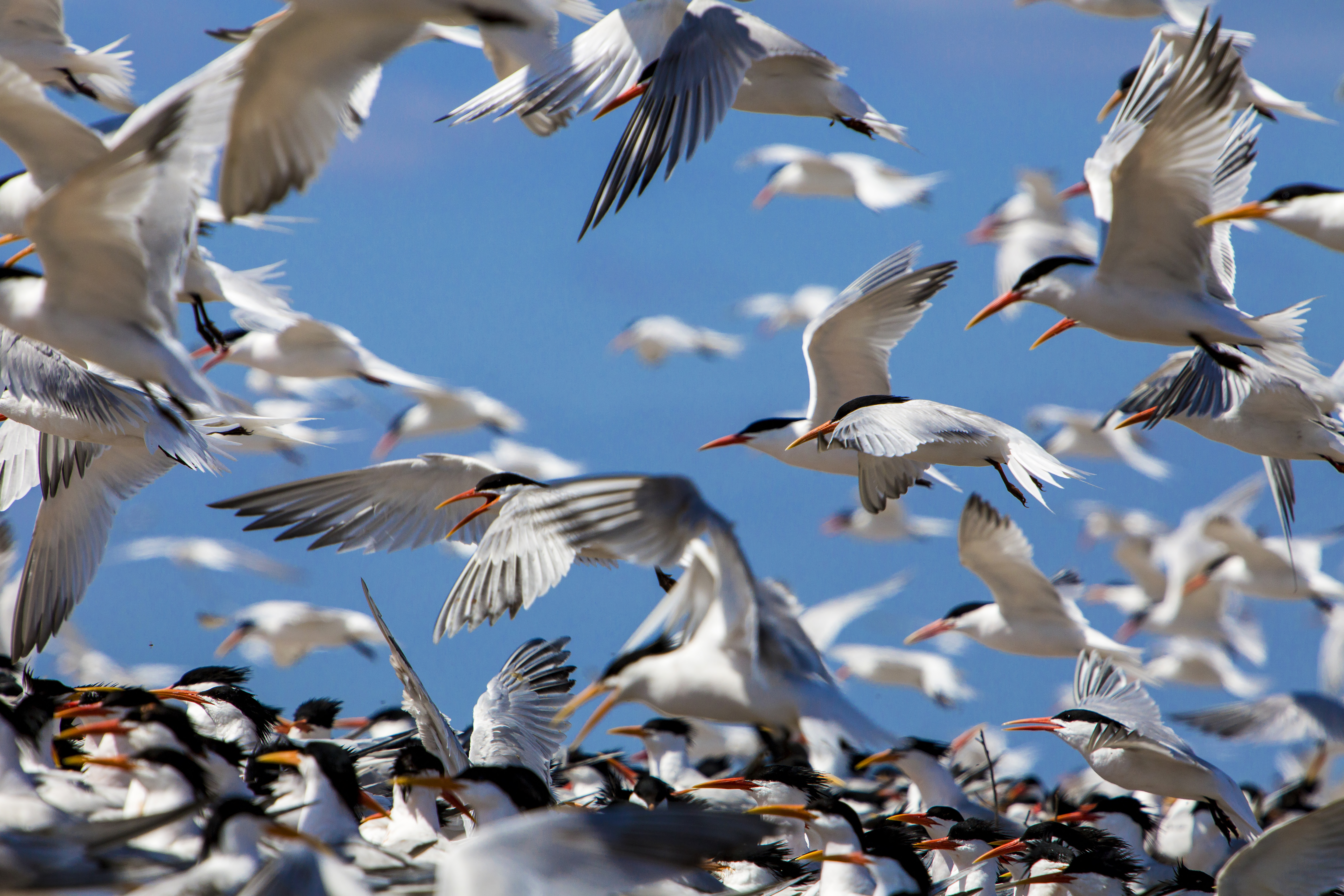 A flock of elegant terns in flight at San Diego Bay National Wildlife Refuge, California.
