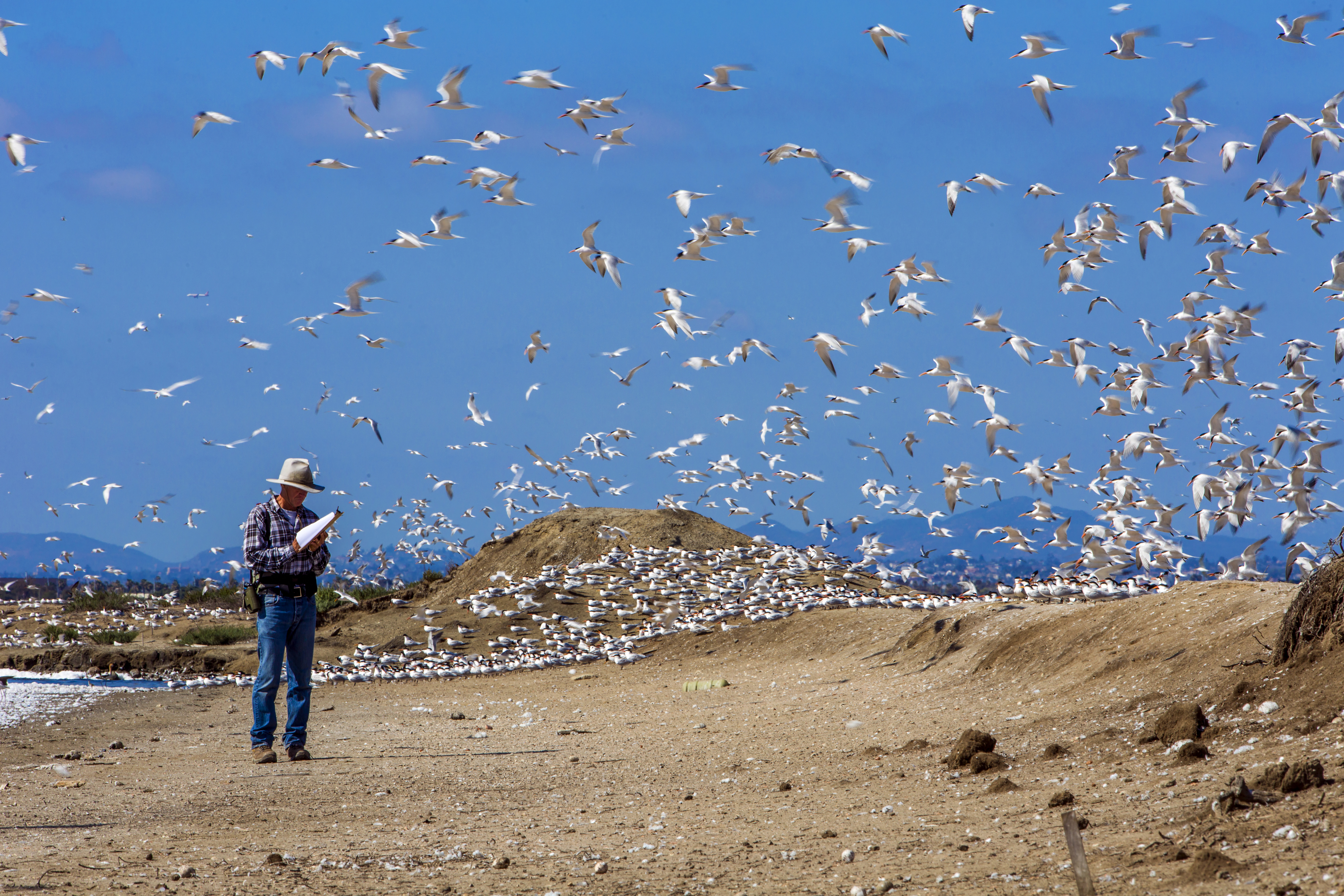 A flock of elegant terns in flight at San Diego Bay National Wildlife Refuge, California.