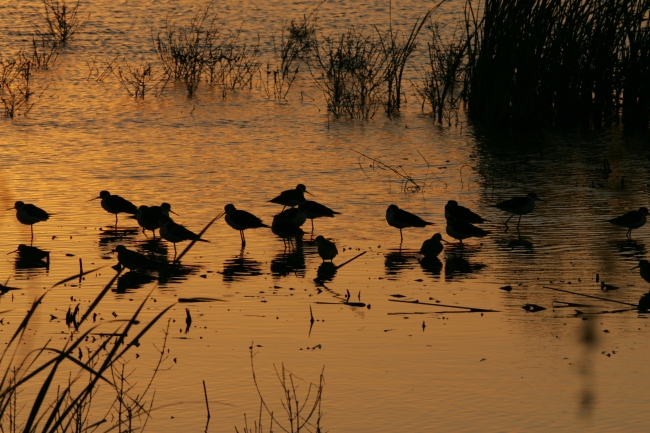 Shorebirds resting at sunset