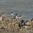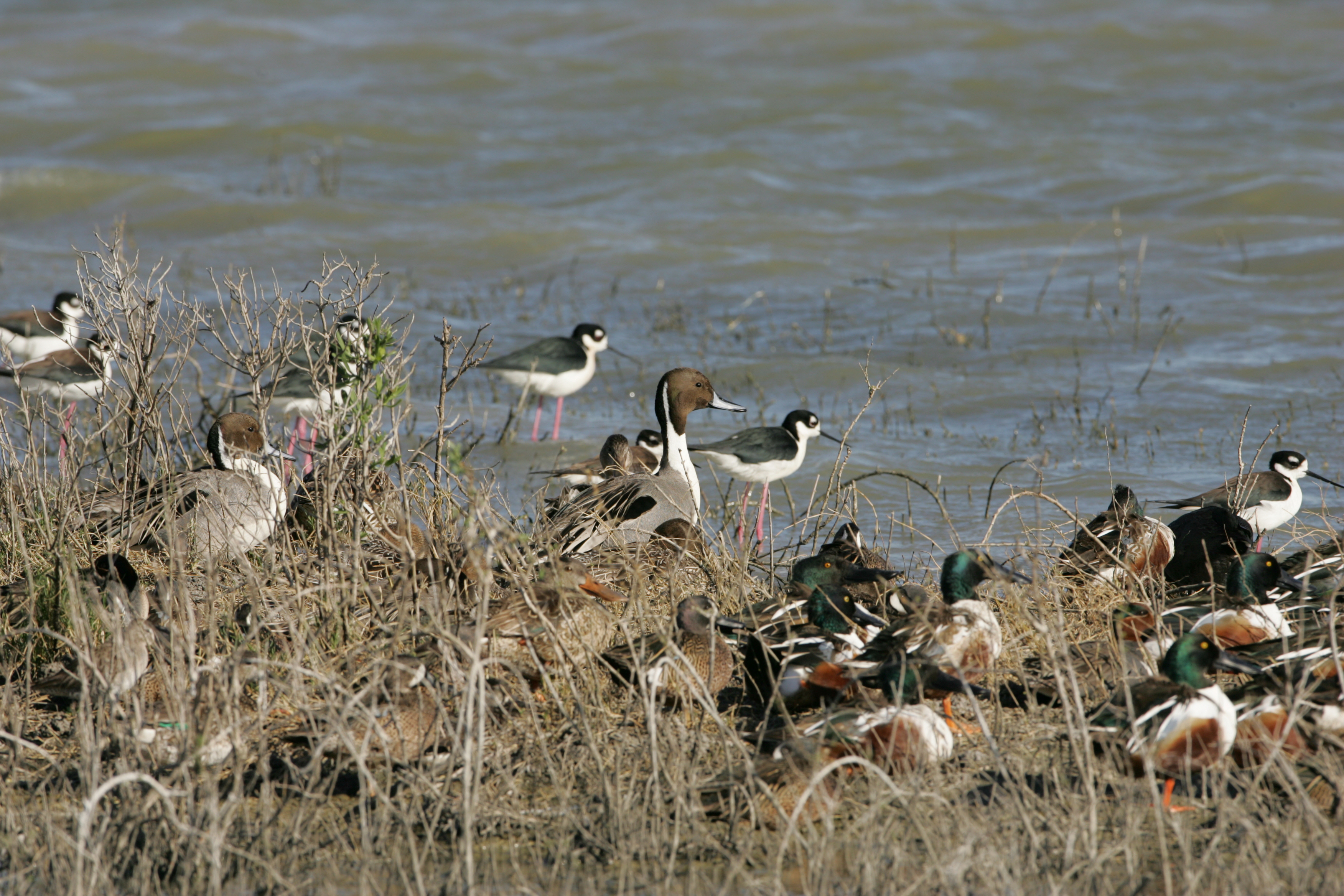 Flock of waterfowl and wading birds at waters edge