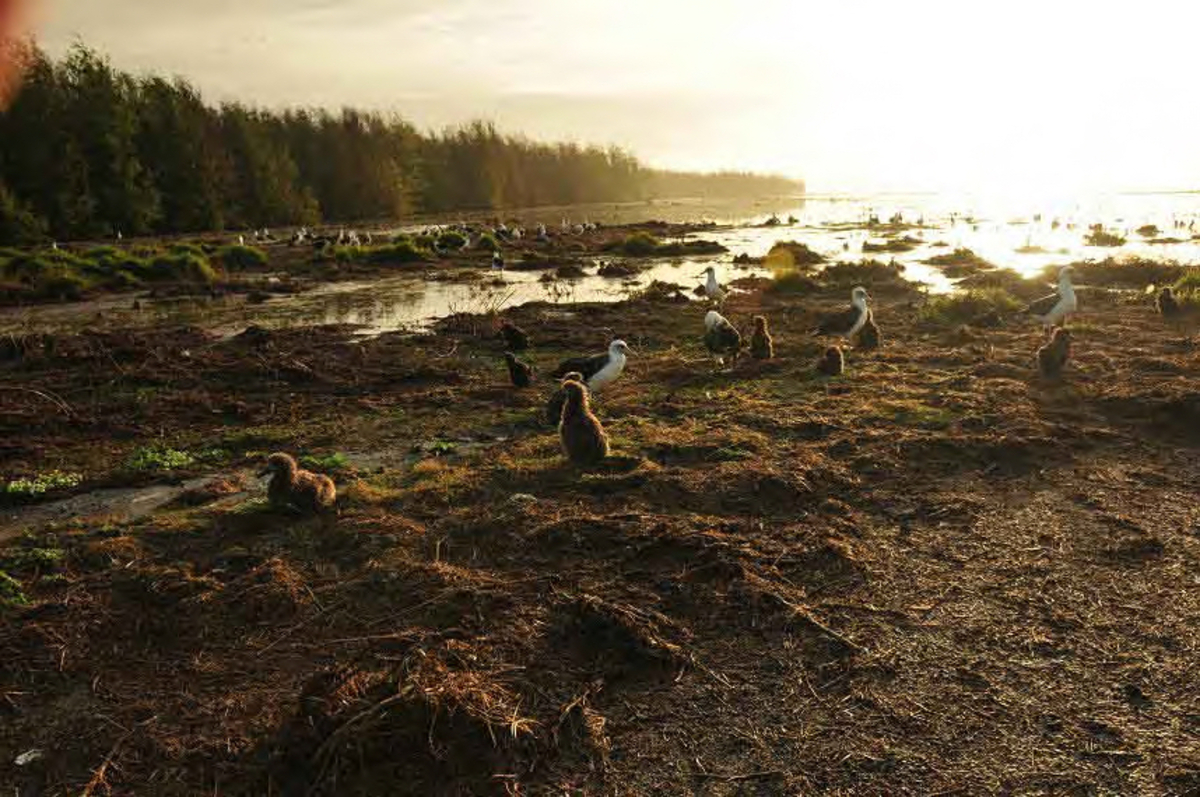 Sand Island is the largest of the three islands at Midway Atoll. This picture shows a flooded ares in the aftermath of the tsunami at sunrise. A tsunami generated by a powerful earthquake off the coast of Japan struck the refuge at 11:36 PM on Thursday, March 10th and continued for the next few hours. While Spit Island was completely washed over, Eastern and Sand Island were 60% and 20% washed over, respectively. Image taken from USFWS Pacific Region Flickr page.