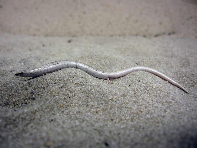 This tiny silvery sand skink tops out at four inches long in adulthood and is known for "swimming" through the sand, its specially adapted front legs pressed into grooves along its body giving it a snake-like appearance. It lives on the scrub ridges and northern highlands of central Florida, but habitat loss, degradation, and fragmentation have drastically reduced their numbers.