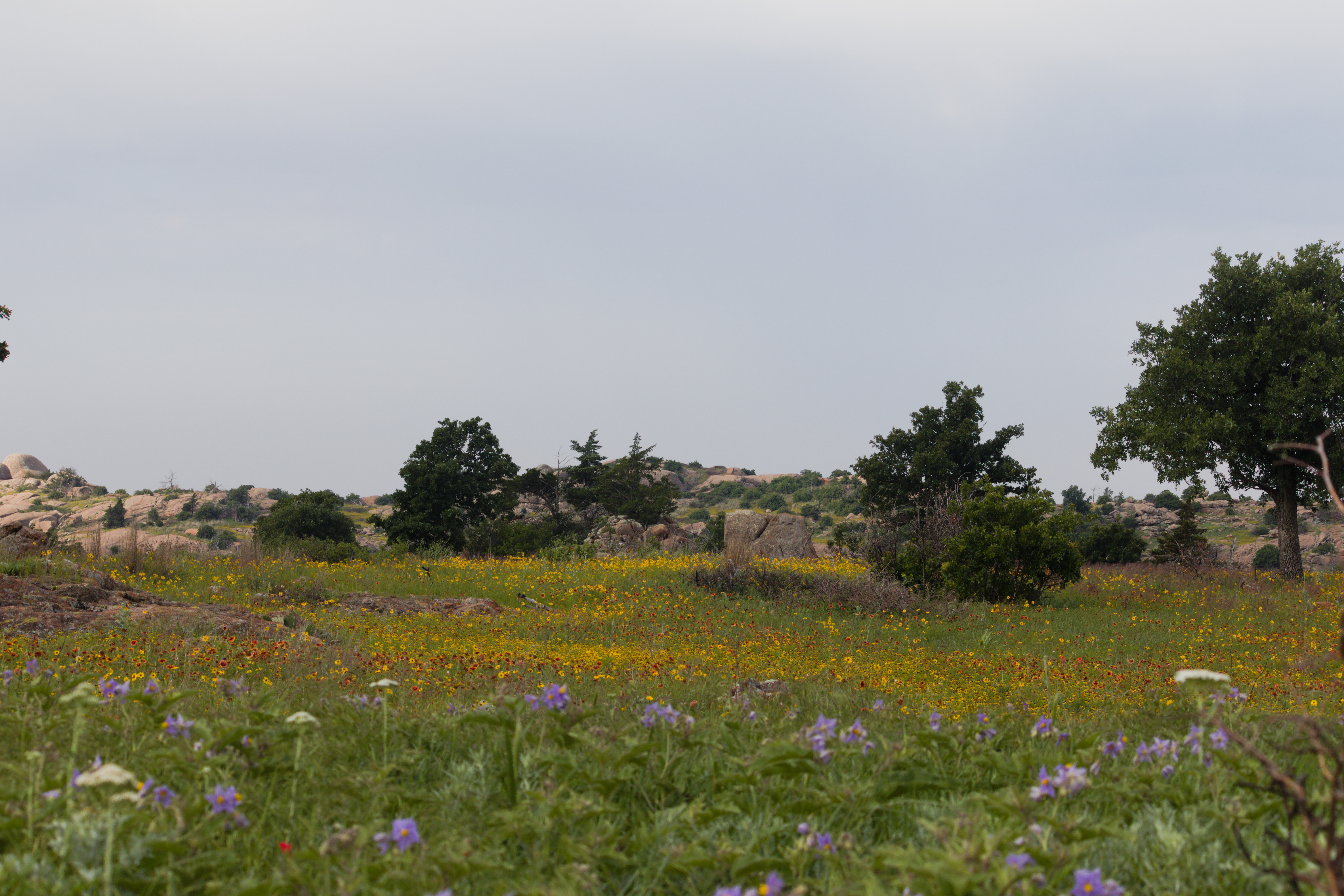 A prairie blooms in the midst of an oak scrubland at Wichita Mountains Wildlife Refuge. Prescribed fire keeps the canopy open and woody encroachment under control, allowing native prairie flowers to thrive.