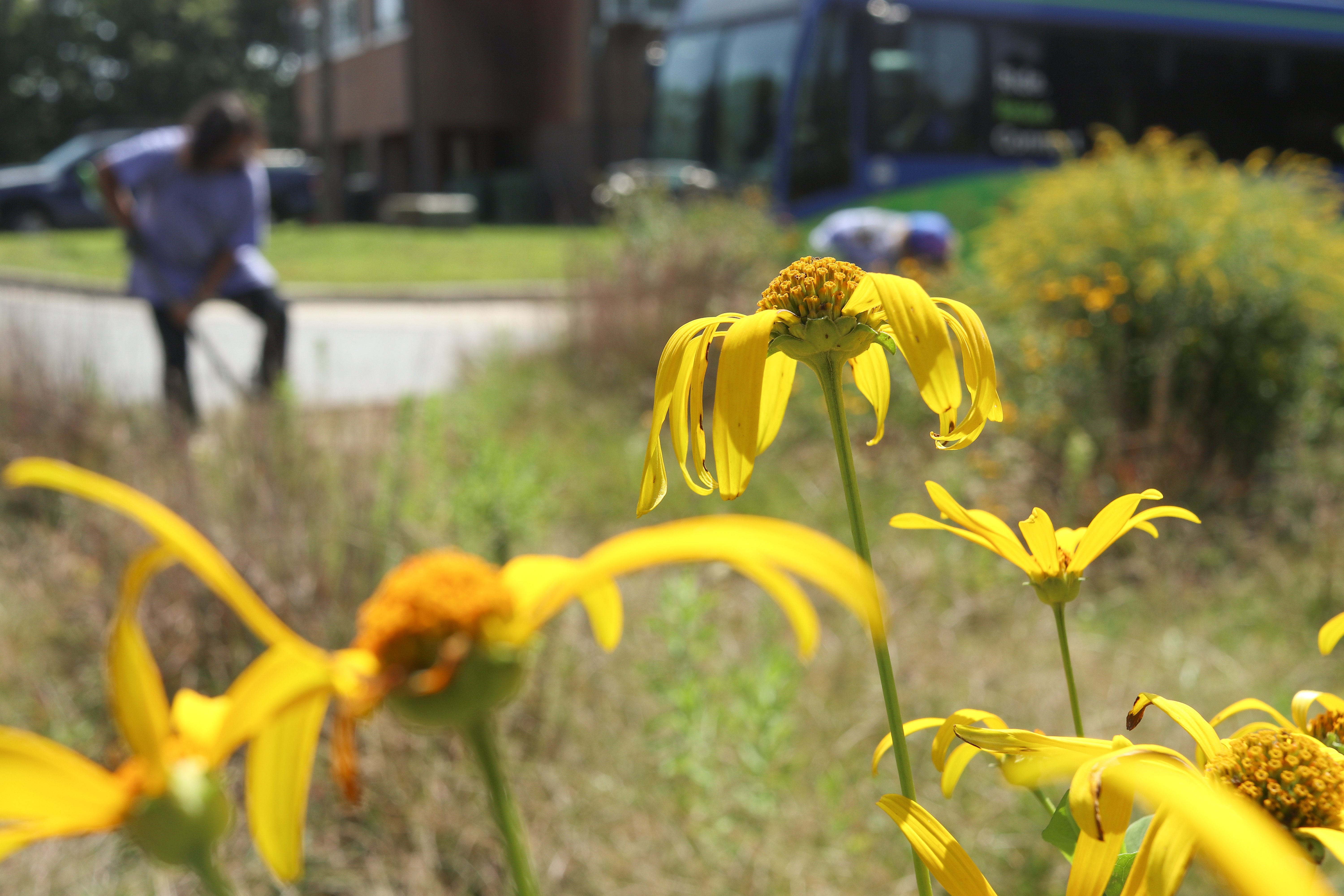 Warren Wilson College students helping maintain the pollinator garden at the Klondyke Homes community, Asheville, NC.