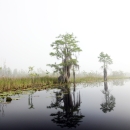 The waters of Okefenokee Swamp on a foggy day reflect cypress trees growing on the edges of a canal.