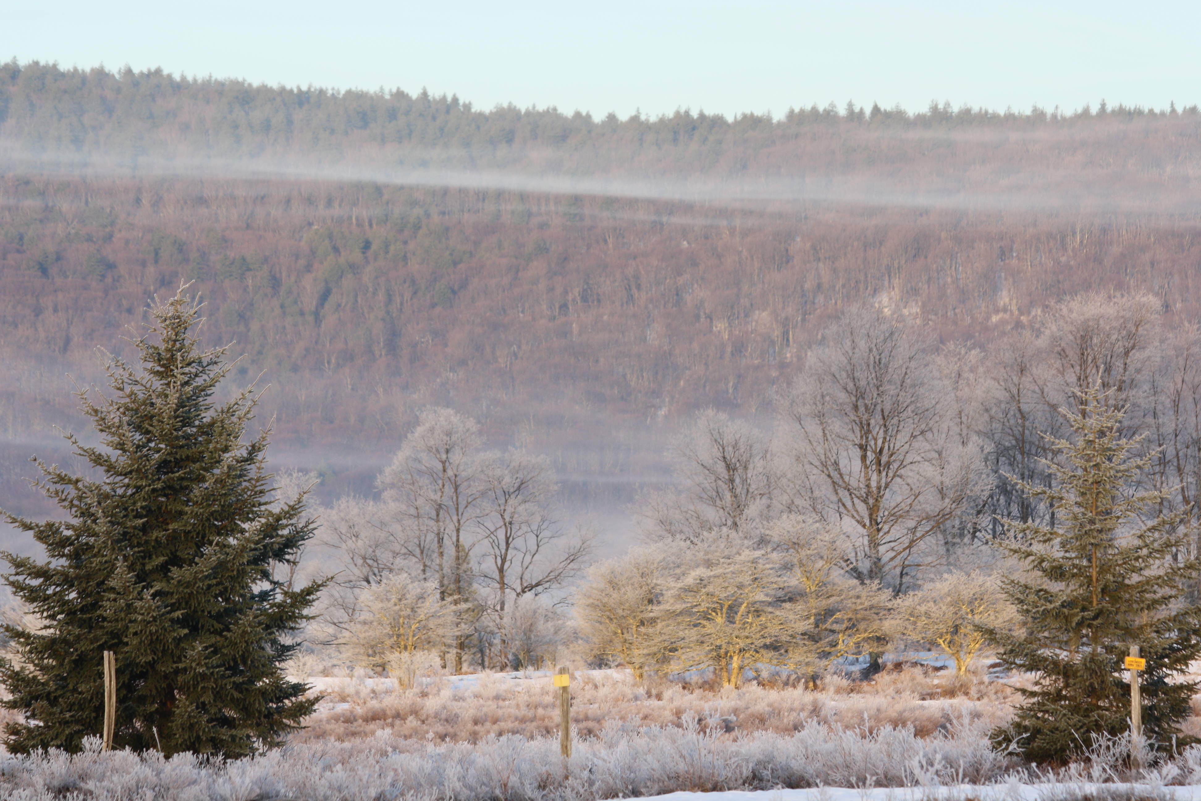 Foggy spring sunrise over Cabin Mountain