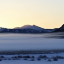 The sun peeks over the mountains during a snowy sunrise with a layer of fog blanketing the valley floor at Red Rock Lakes National Wildlife Refuge. Photo by Cortez Rohr/USFWS