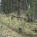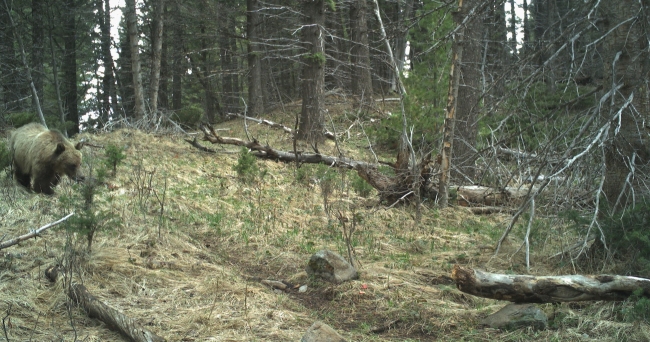 A grizzly bear traverses the forest floor at Red Rock Lakes National Wildlife Refuge and is photographed with a remote wildlife camera. While visiting the Refuge, it is strongly recommended to have bear spray on your person and follow safety precautions during your visit.