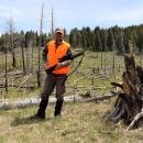 A hunter stands at the edge of the forest wearing bright orange with firearm pointed in a safe direction at Red Rock Lakes National Wildlife Refuge. Photo by Cortez Rohr/USFWS.