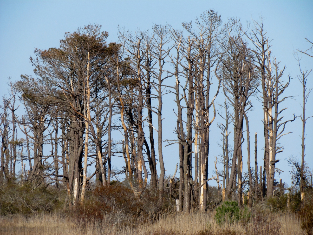 It has been said by many that the native Southern Pine beetle, Dendroctonus frontalis, is one of the most destructive insect pests to pines. Here at Chincoteague National Wildlife Refuge, Loblolly Pine trees are a haven to the Southern Pine beetle for shelter, breeding, nesting, and feeding. These beetles chew and burrow their way through the bark and the inner parts of the tree, killing a healthy tree in a month. Many of the pine trees on Chincoteague National Wildlife Refuge are the perfect habitat for the Southern Pine beetle. Sadly, the tree that allows the beetle to survive will quickly die. A large number of the Loblolly Pine trees, found on Assateague Island are reaching the end of their lifespan and are also affected by salt stress due to sea level rise. Since the trees are already weakening, they make a good starting habitat for the Southern Pine beetle because it is easier to break the tree’s defenses.