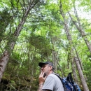 Shawn Swartz of the Forest Stewards Guild stands amidst a high elevation forest in North Carolina's Black Mountains, considering a strategy for restoring red spruce to the forest.