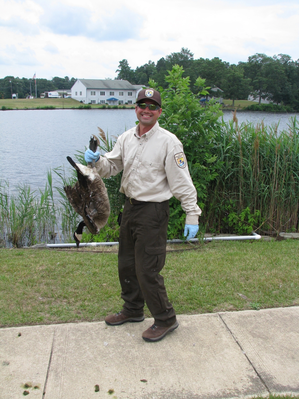 Edwin B. Forsythe employee teaching how to band a Canada Goose in Southern New Jersey