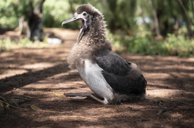 A four-month-old mōlī or Laysan albatross chick yawns. The chick hatched from a nest with two female parents. If female-female pairs successfully incubate an egg to hatch, studies show that they are just as successful as their male-female counterparts at raising their chicks to fledge.