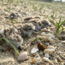 Four fluffy tan and white chicks lay on a sand and gravel beach with small grasses growing up around them.