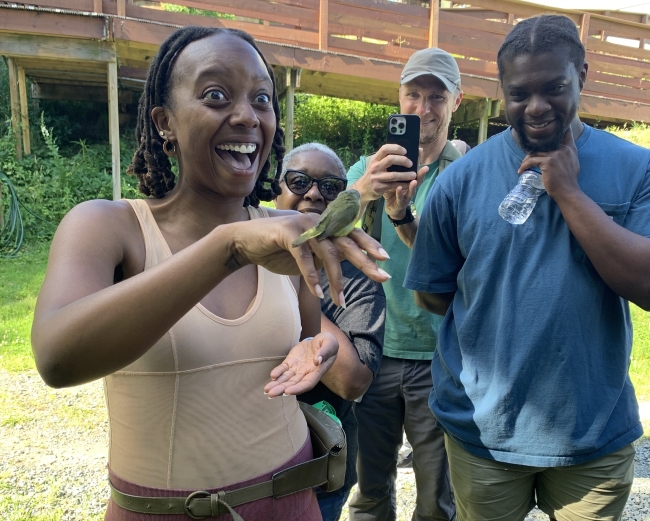 Friends of Masonville Cove member readies to release a banded mourningwarbler